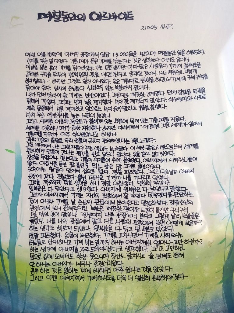 아버지와 함께 정리를 하다보니 중학교 2학년 여름방학 때 아버지 공장에서 일을 도왔던 일이 생각났다. 아버지는 아들들에게 노동과 돈의 가치를 알려주려 하셨던거 같다. 동생은 그 일을 글로 적어 백일장에서 상도 받고 그랬지만 나에겐 좋았던 경험은 아니었다. 기계의 기름때를 제거하는 단순한 일이었지만 더운날 일을 한다는건 쉽지 않은 일이었다. 땀, 기름냄새, 기름때 등 일당 만오천원의 달콤함 외엔 즐거웠던 기억은 아니었던 것이다.