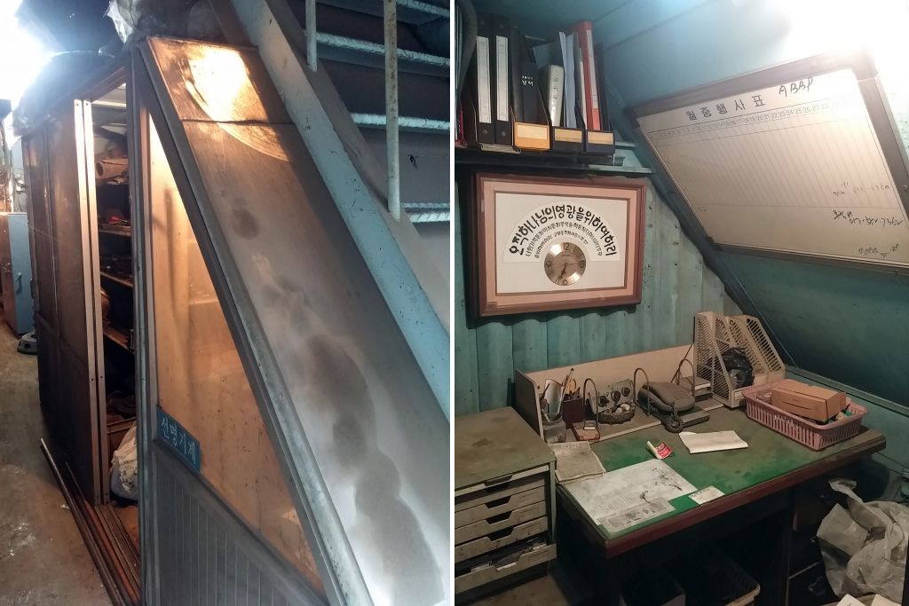 그 때 내가 이해하기 힘들었던 것 중 하나가 아버지의 사무실이었다. 아버지 공장은 다른 공장과 달리 천장이 낮았다. 세를 내줄 사무실을 짓기 위해 층을 둘로 나눈 탓이었다. 덕분에 25평의 작은 공장임에도 불구하고 번듯한 사무실이 세 개나 있었다. 그런데 당시 아버지는 2층의 번듯한 사무실들은 모두 다 세를 주고 계단 옆 1평도 안되는 곳을 사무실으로 사용하셨다. 지금이야 그곳이 낭만적으로 보이지만 어린 내 눈엔 그저 좁고 더운 사무실일 뿐이었다.