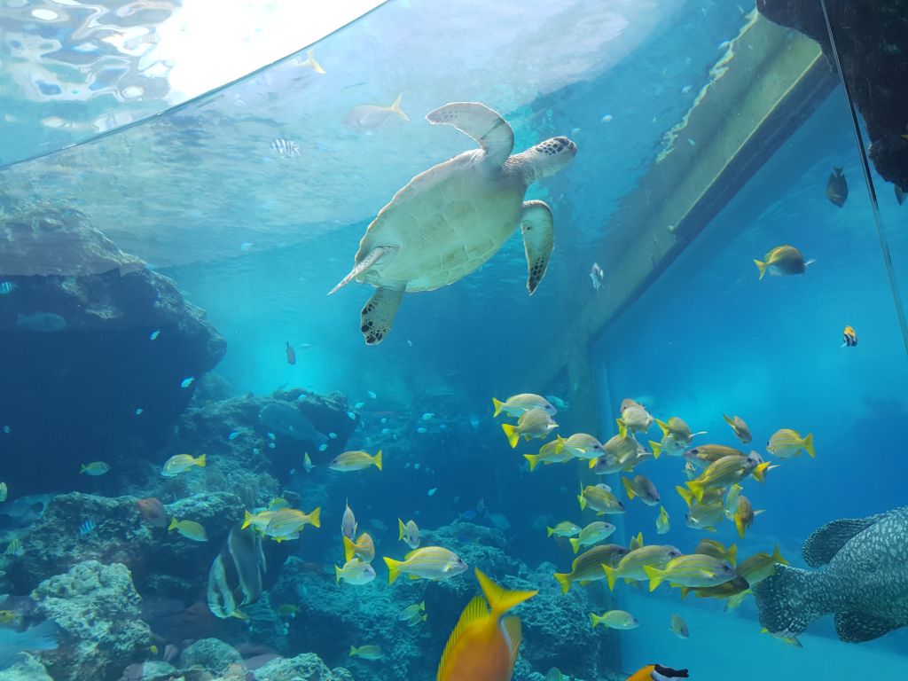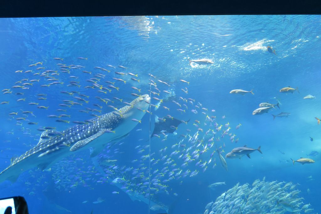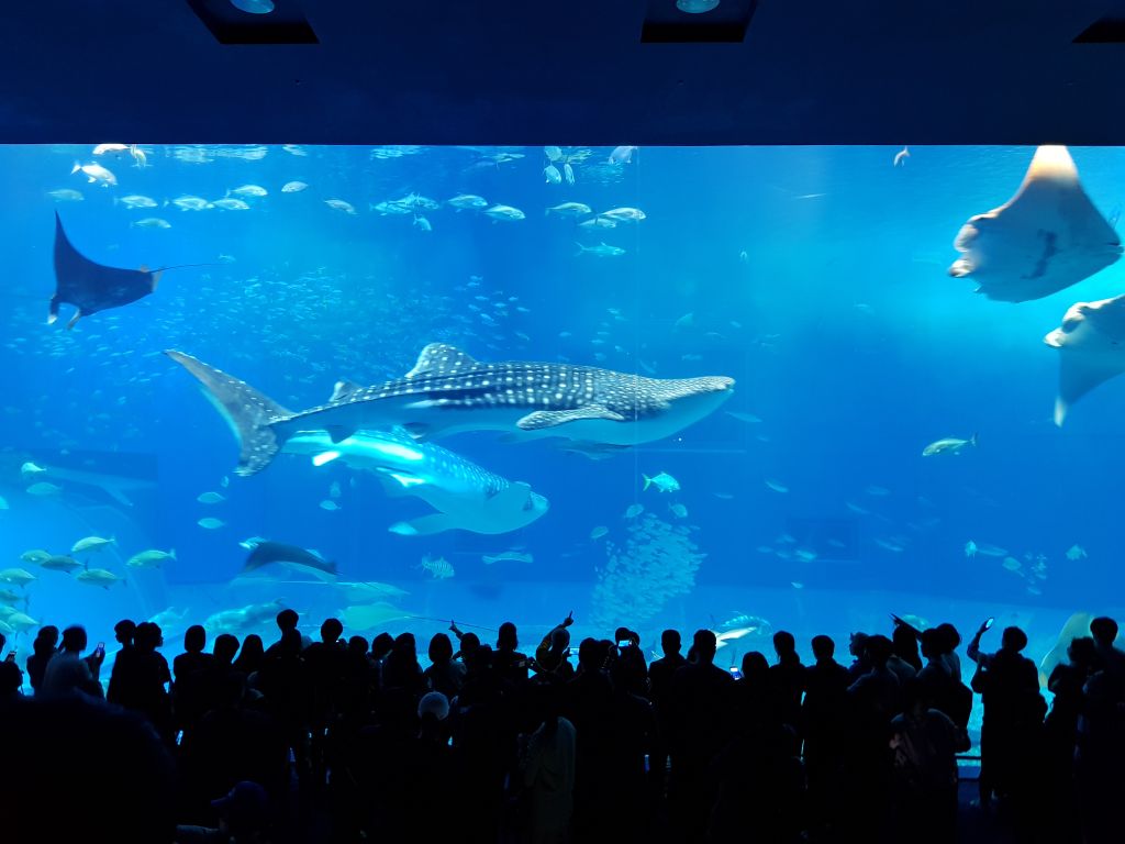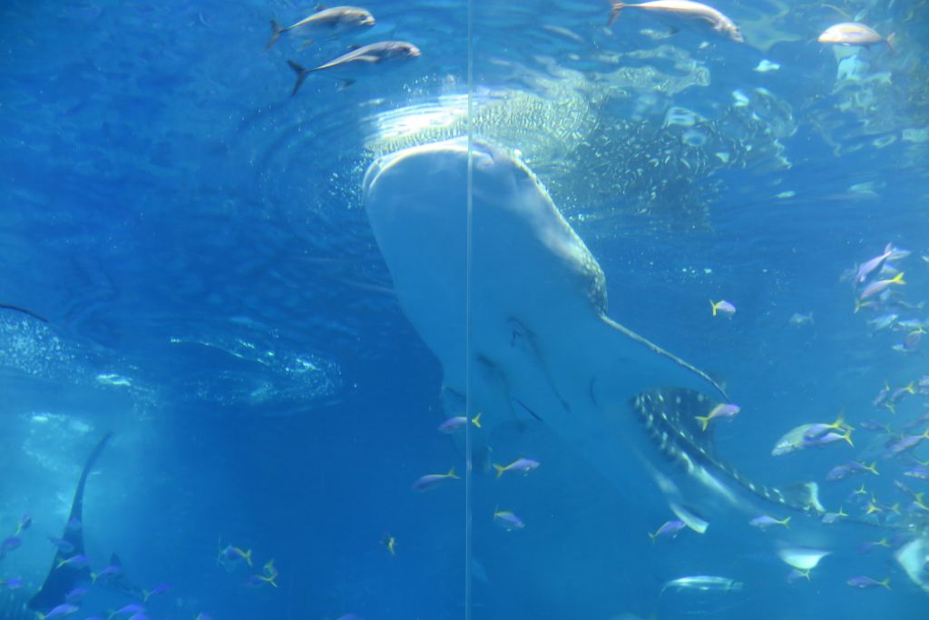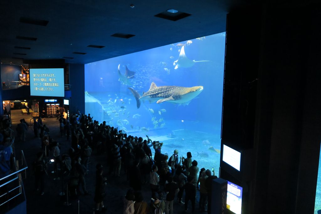 츄라우미 수족관에서는 하루 4번, 고래 상어에게 먹이를 주는걸 구경 할 수 있는데요 수조의 크기가 어마어마 합니다.