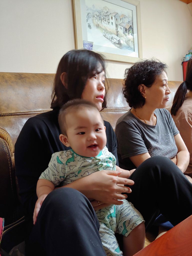 우성이 외삼촌이 사온 망고를 손에 쥐고 지민이 이모랑 노는 서현.