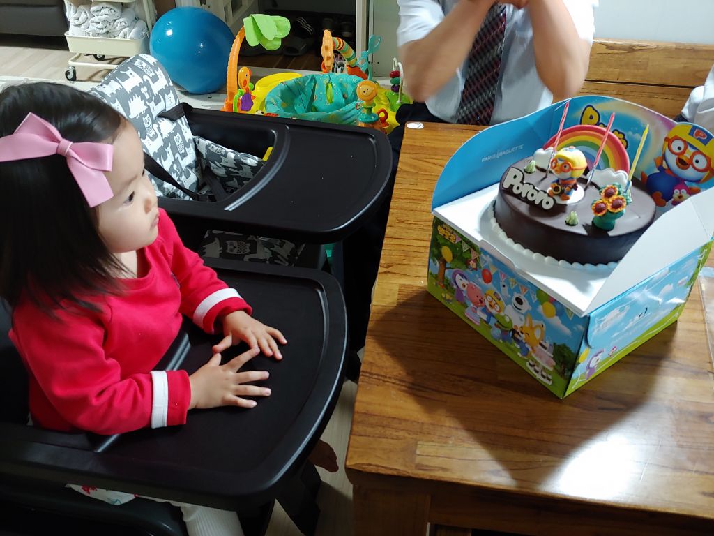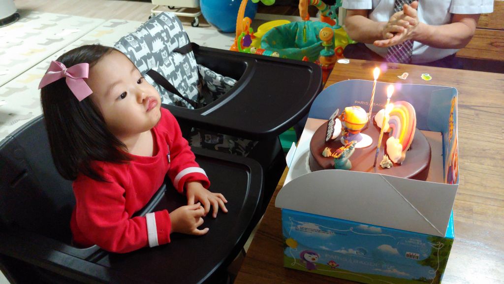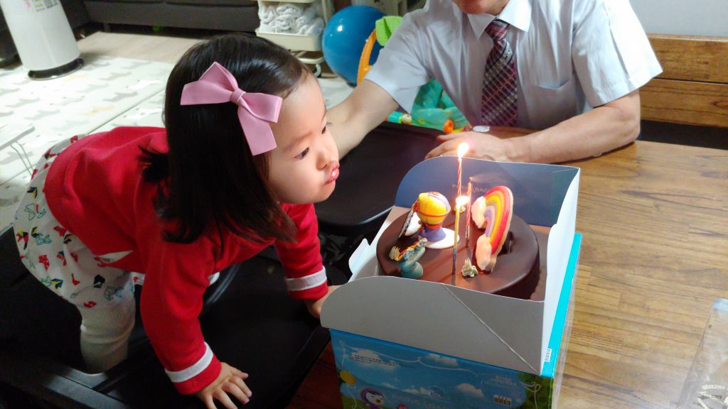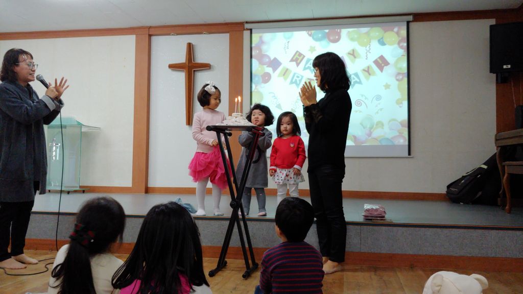강대상 위로 올라가서 생일 축하 케이크에 촛불도 끄고 (실제로는 앞에 파란색, 빨간색 스트라이프 옷 입은 남자아이가 불청객으로 껴 들어서 꺼버림 ㅜ)