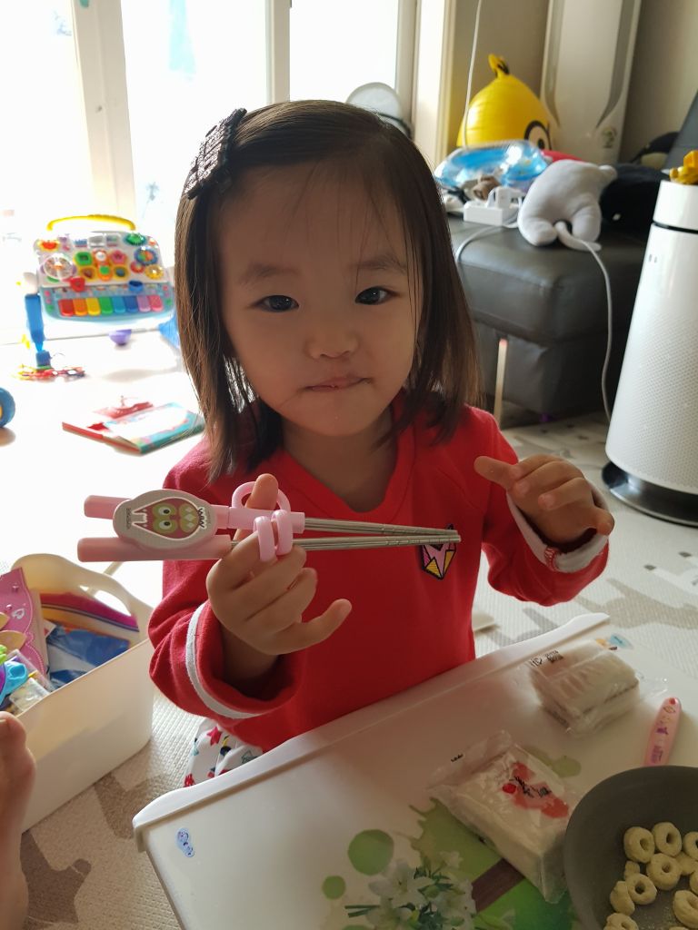 젓가락 발견!! 저 선물 아니었음 젓가락질 시켜볼 생각 전혀 못했을 텐데ㅎㅎ 생각보다 잘하네요^^