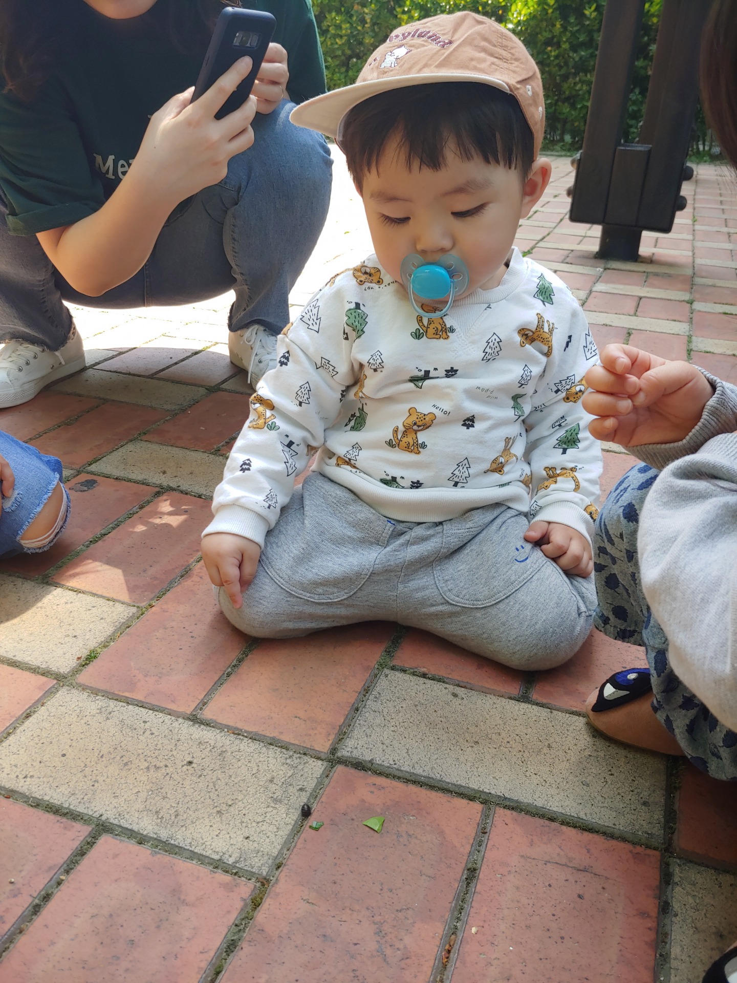 동네 형아, 누나들이 잡아온 콩벌레를 유심히 관찰중인 시현이◉_◉
