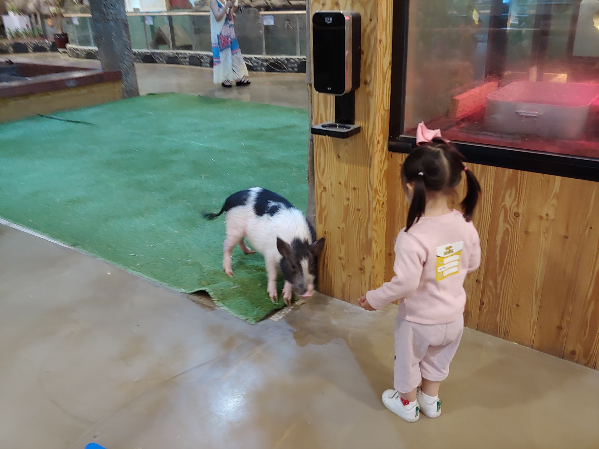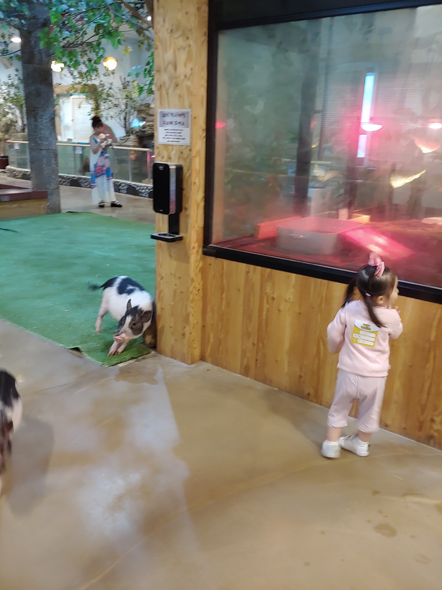 밥 먹고 다시 동물원으로 돌아갔는데 우리에서 탈출(?)한 돼지를 마주한 서현이.