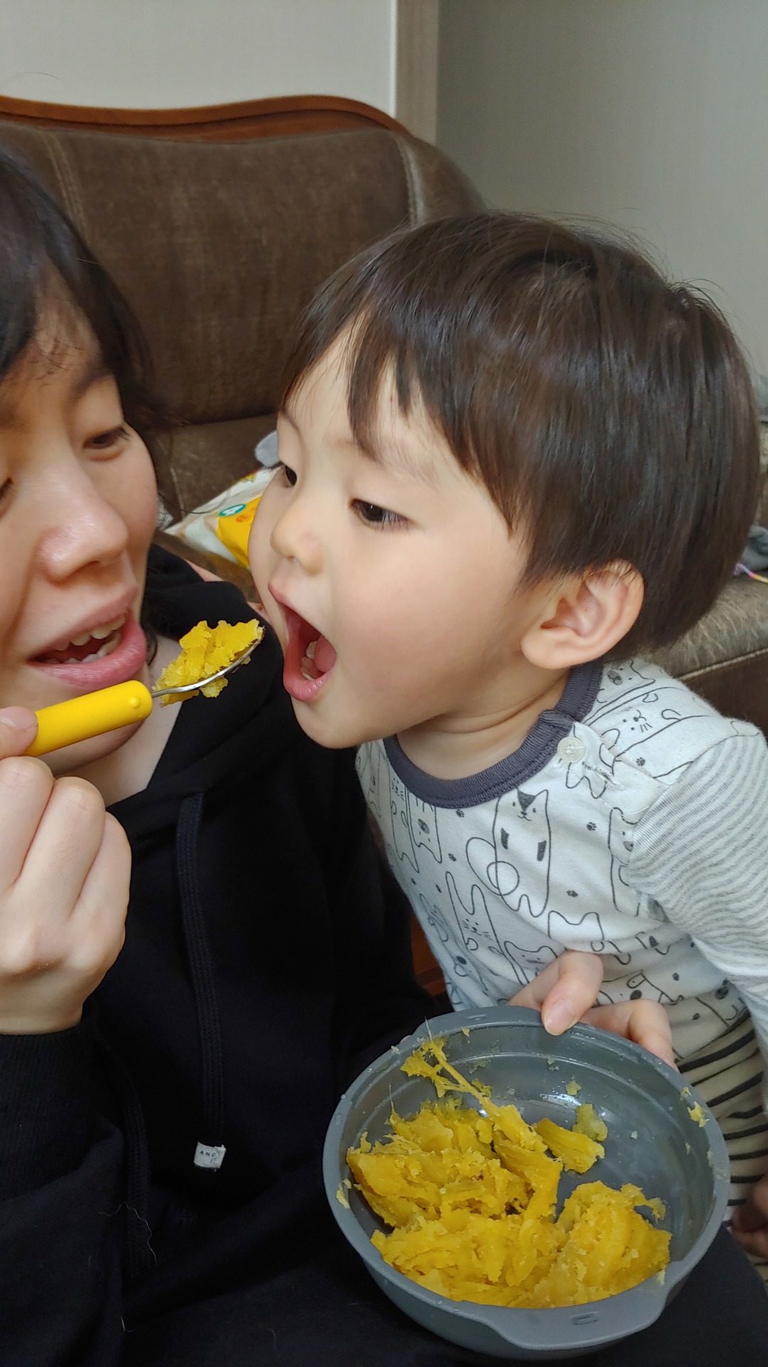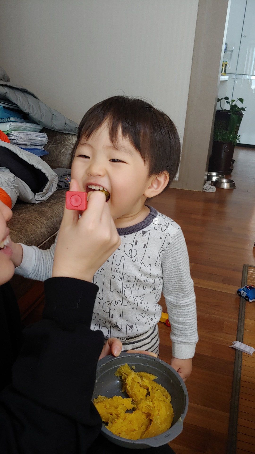 다음날 아침에 할머니가 삶아주신 고구마에 마중나오는 시현이 입(* ̄3 ̄)