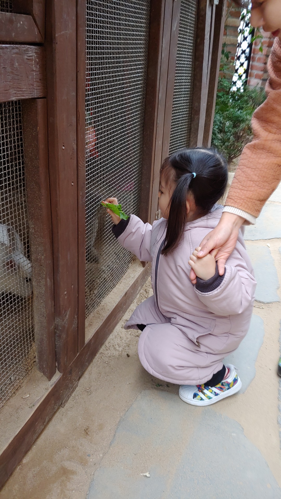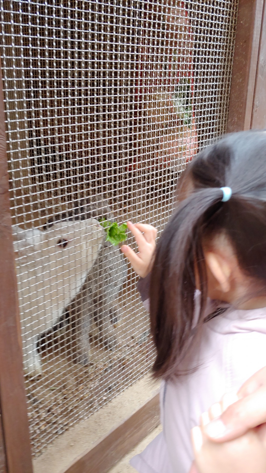 토끼장에 안에 있는 토끼들에게 배추잎을 주고 있네요 ㅎㅎ