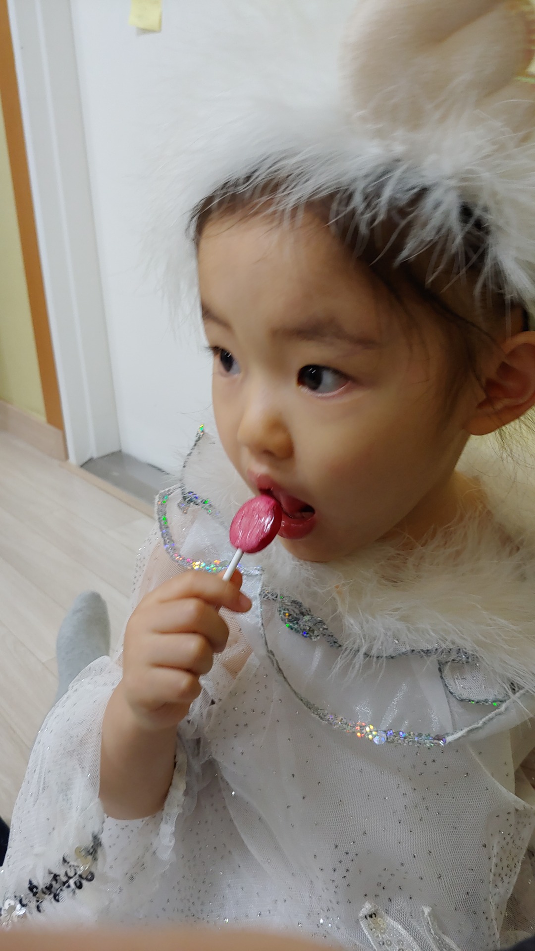 진정된 서현이를 사탕으로 꾀어서 친구들이 준비하는 방으로 왔어요.  사탕을 이렇게 예쁘게 먹는 애기가 있을까요?😊