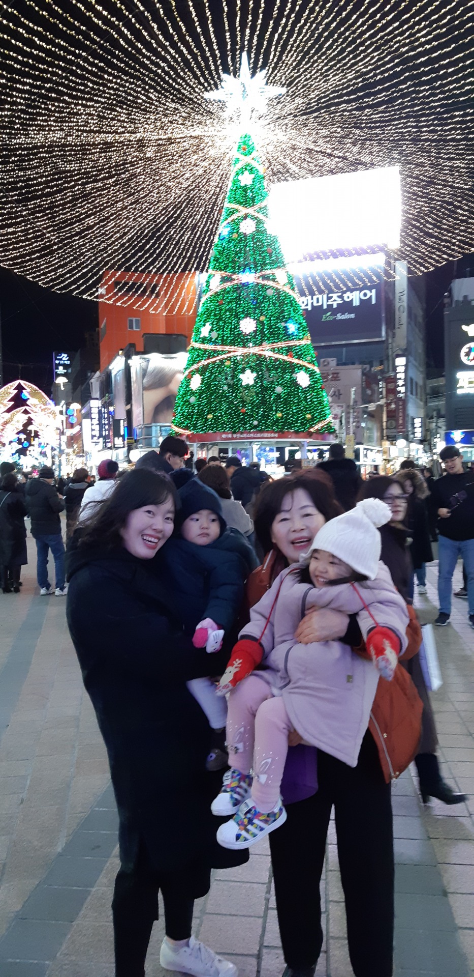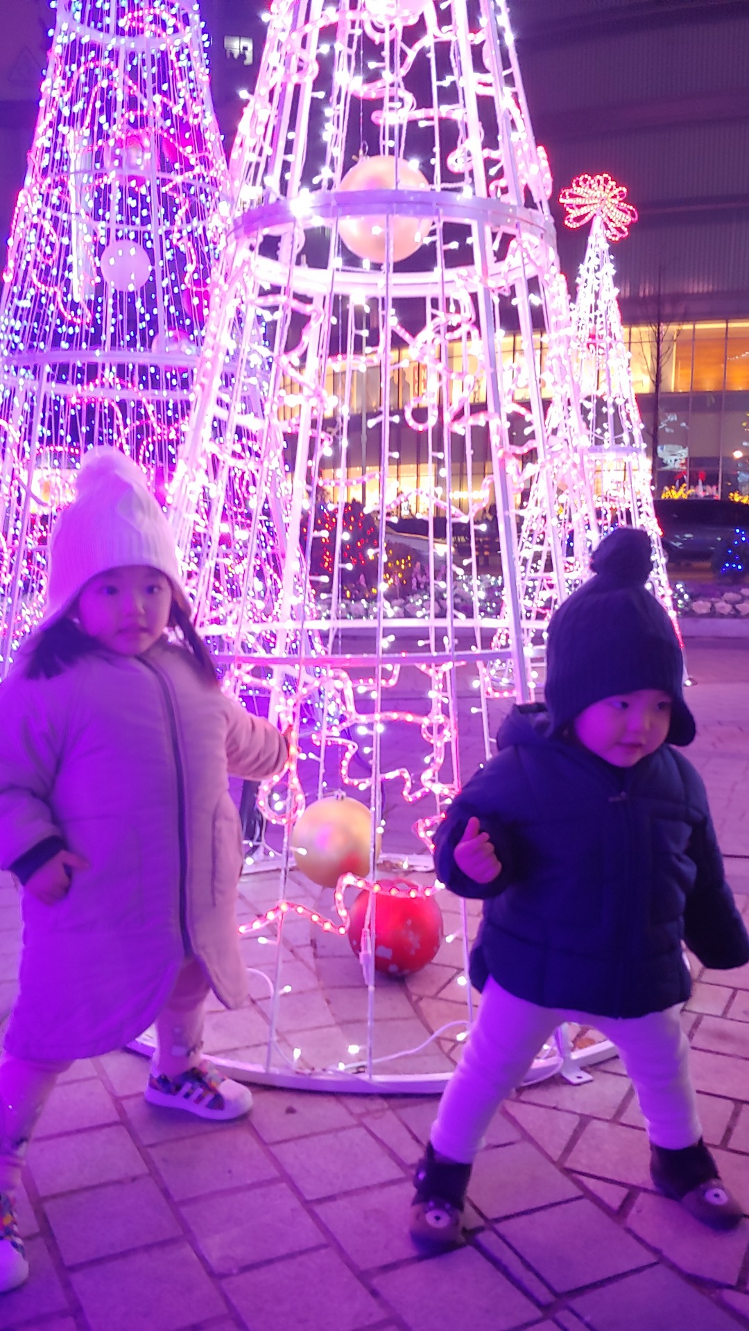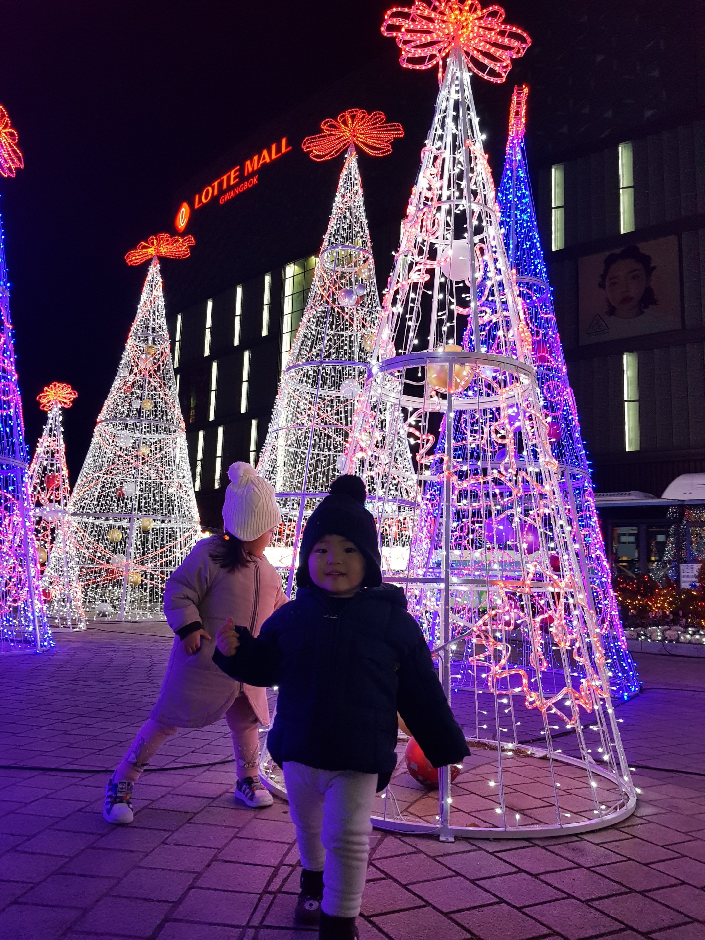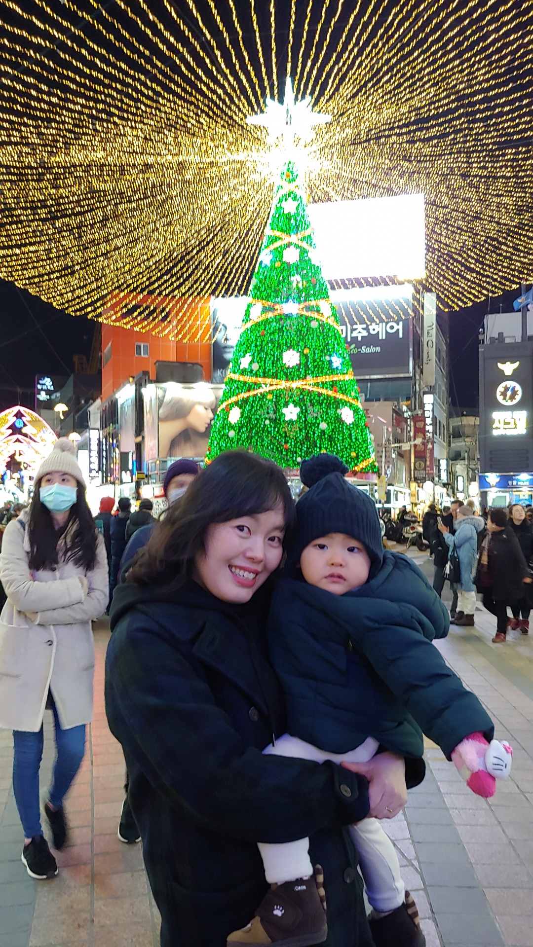 목적지인 크리스마스 트리 앞에 도착한 엄마 아빠와 시현이^^