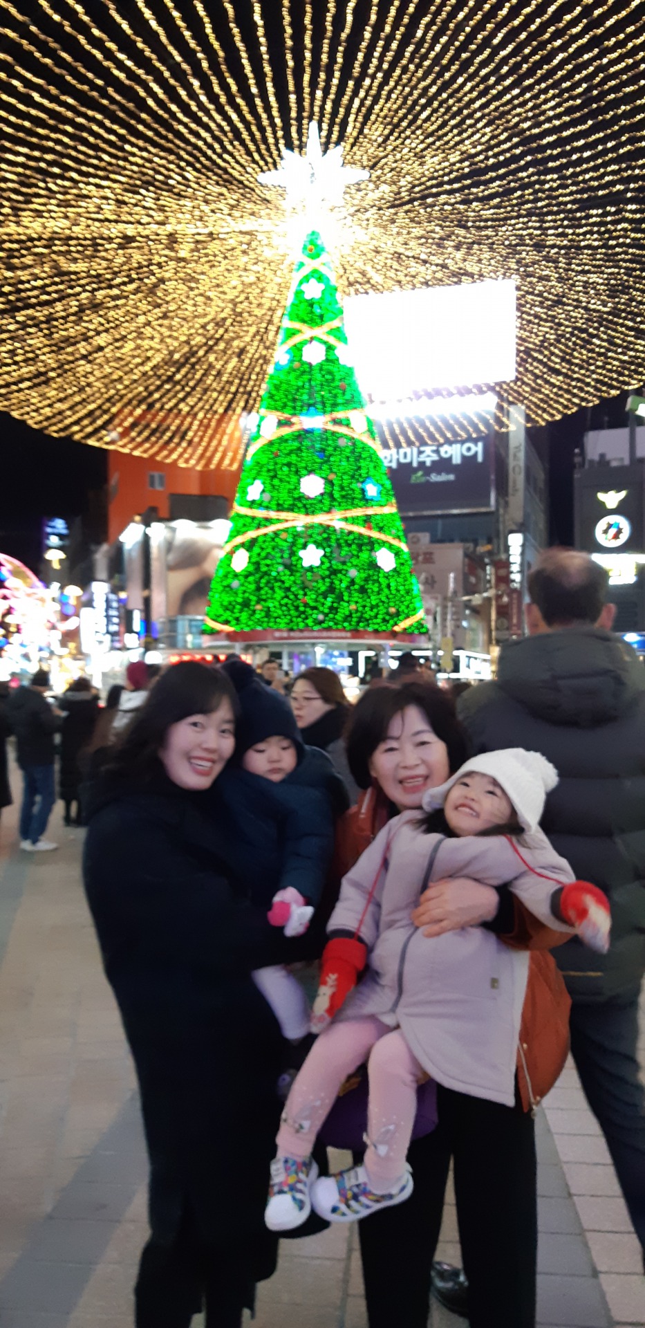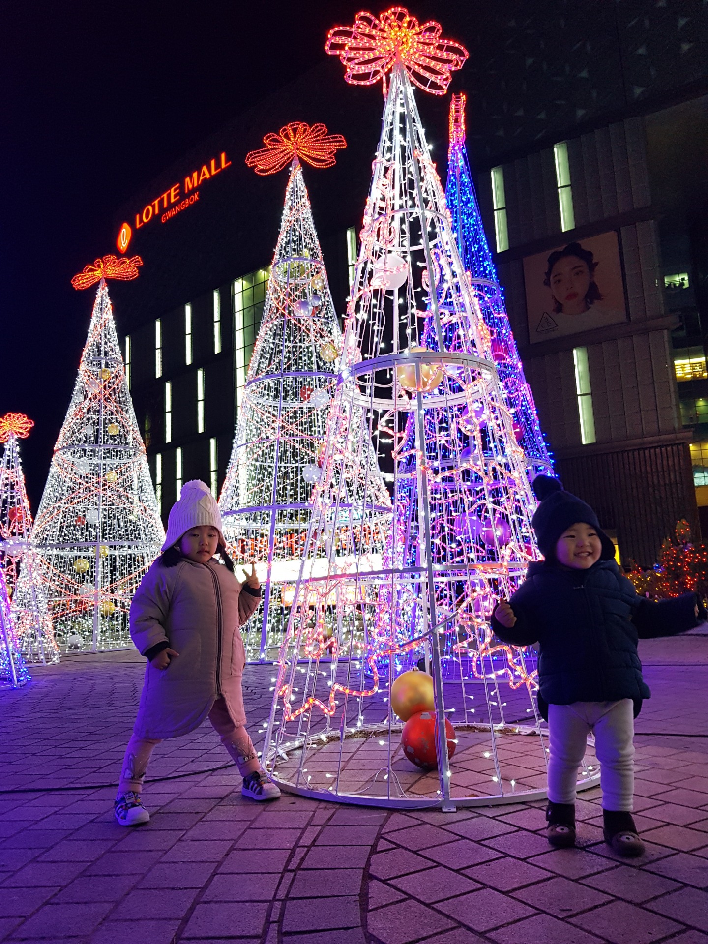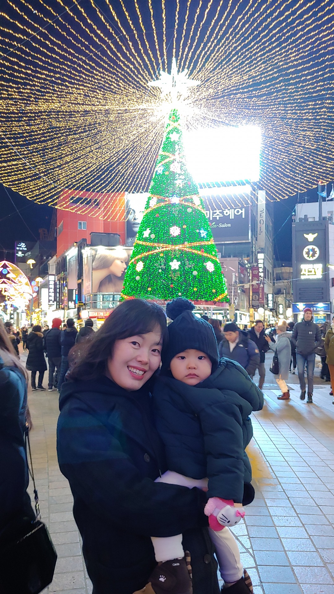 목적지인 크리스마스 트리 앞에 도착한 엄마 아빠와 시현이^^