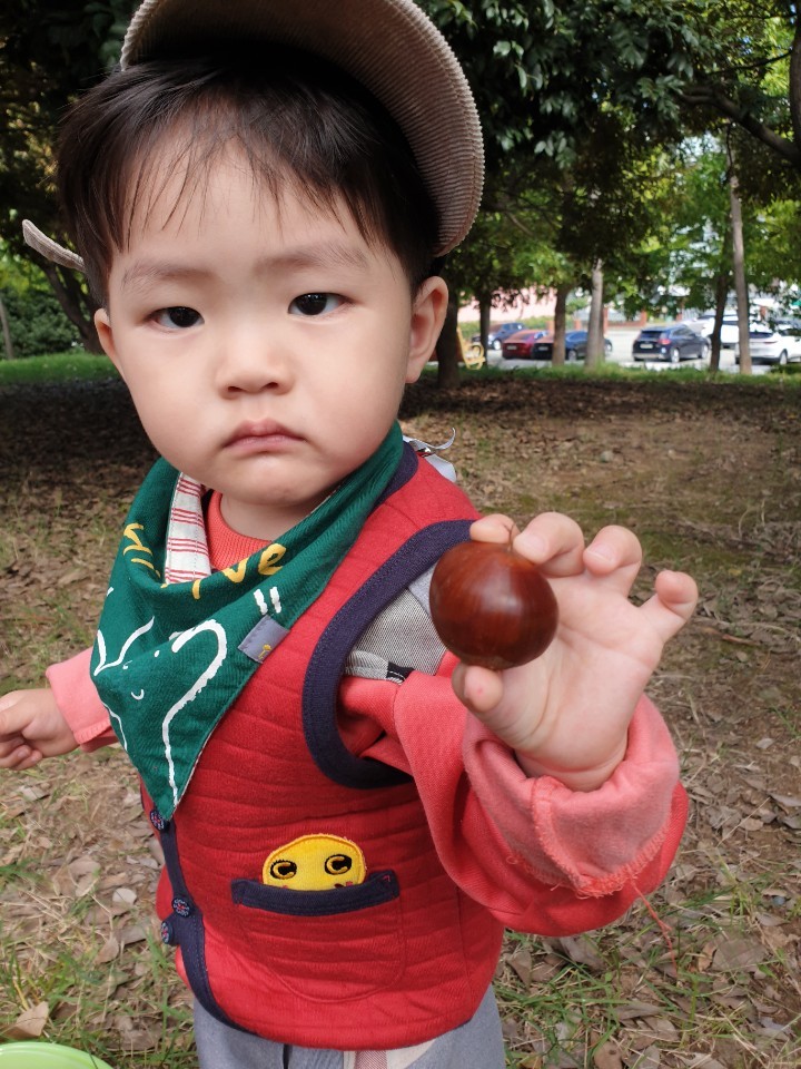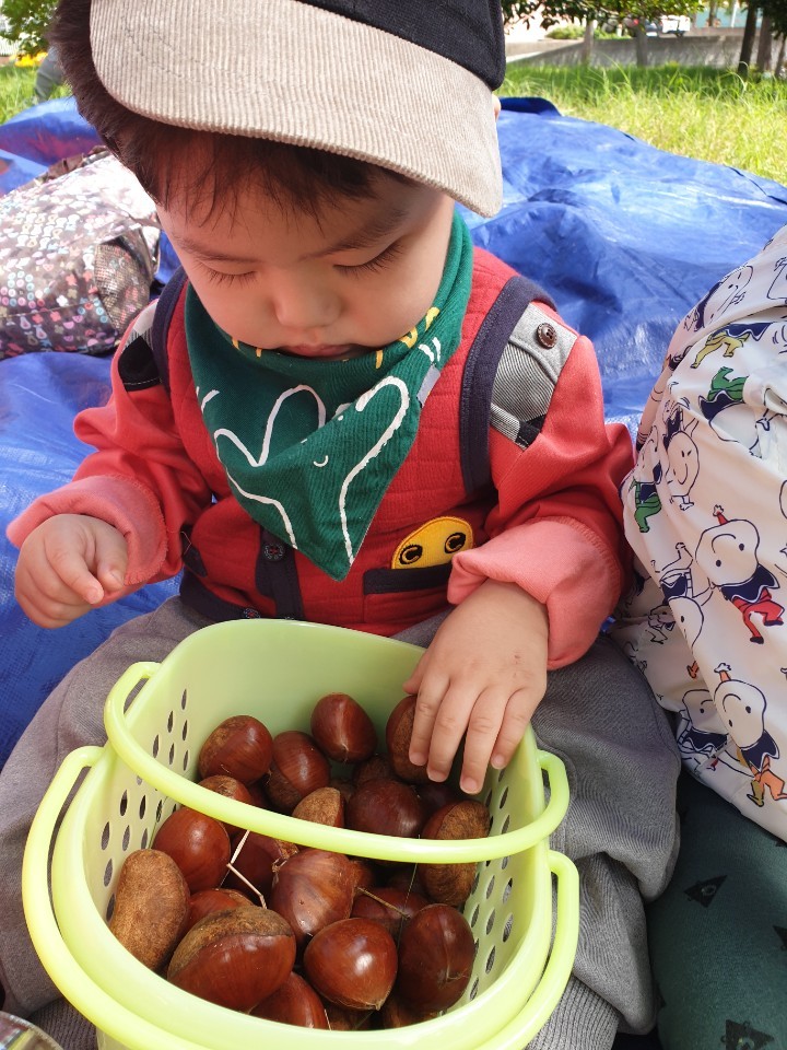 심각한 얼굴로 알밤을 주워서 보이는 시현.