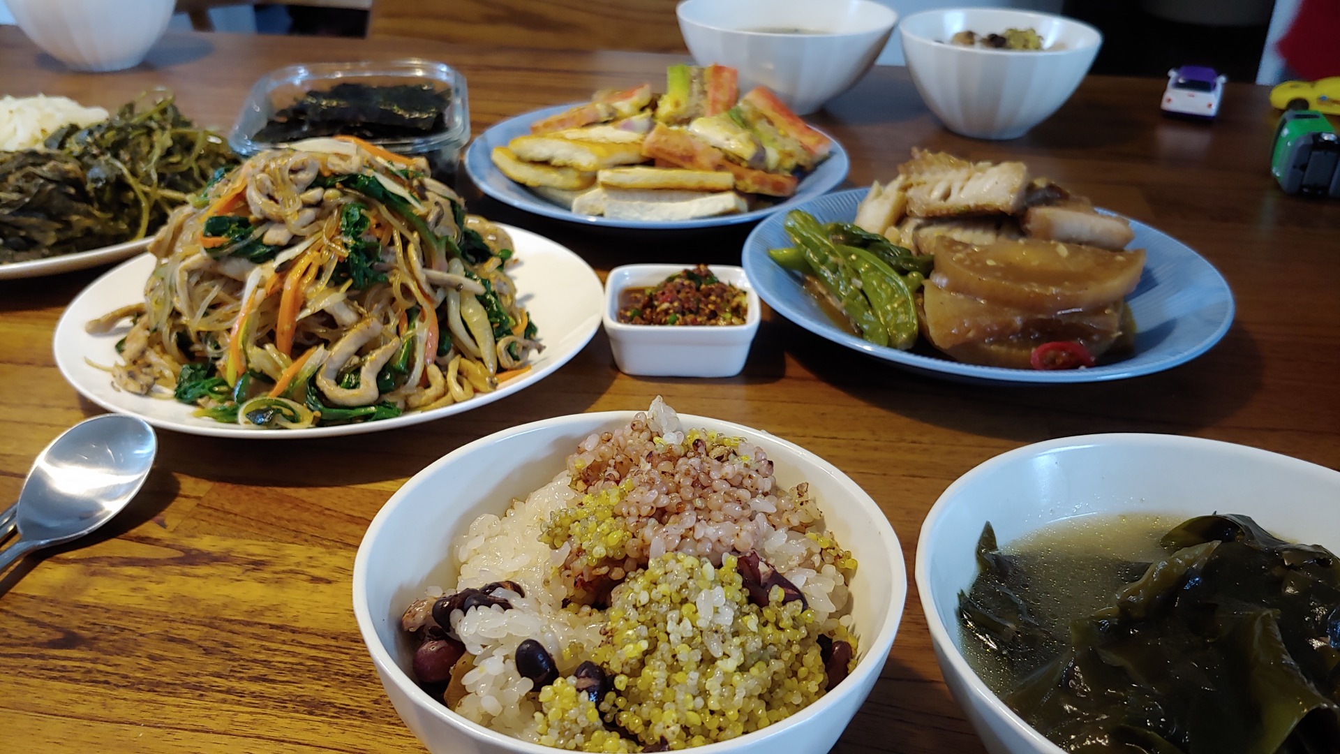 오곡밥, 각종 나물에,  미역국, 잡채, 산적꼬치, 갈치 조림까지 한 상 가득 입니다.