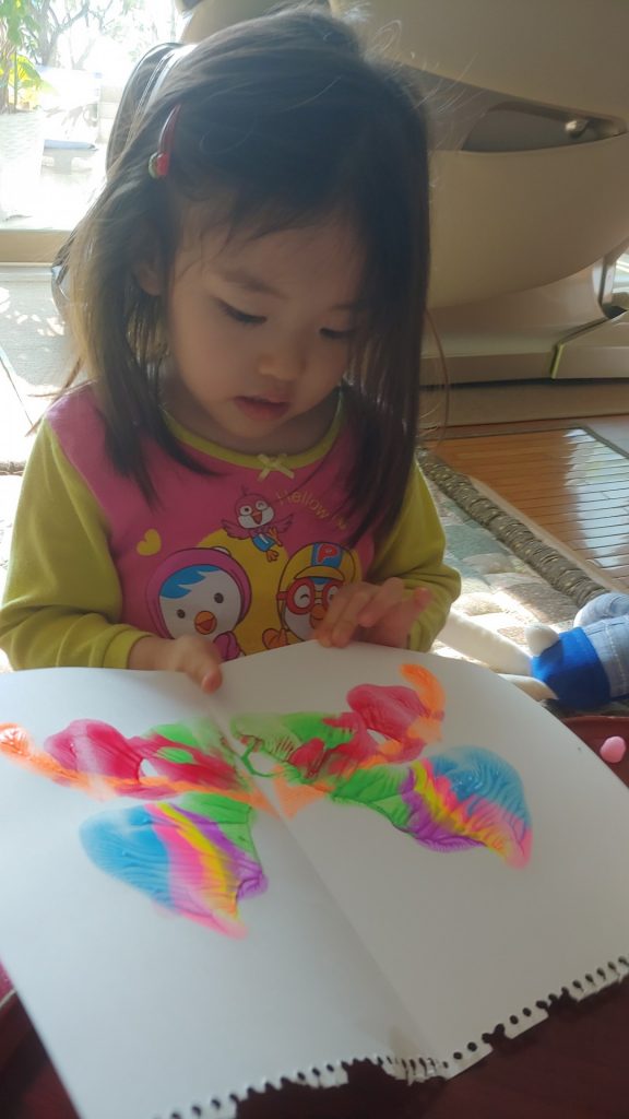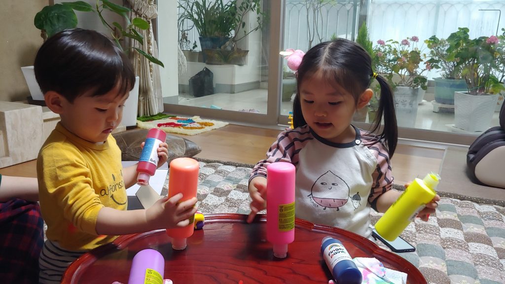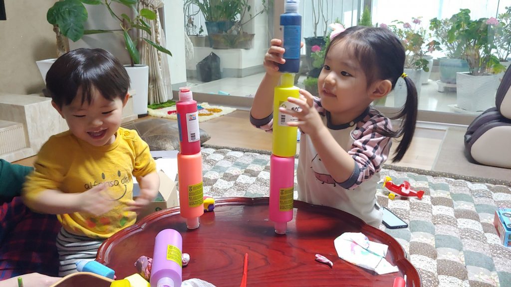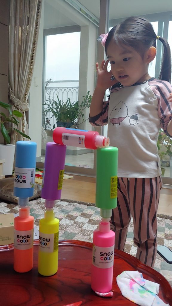 물감 놀이를 충분히한 아이들은 다른 방식으로 물감놀이를 하기 시작한다. 쌓다가 무너지고, 또 쌓다가 무너지고, 이를 몇 번 반복한 후 개선 문 같은게 세워졌다.