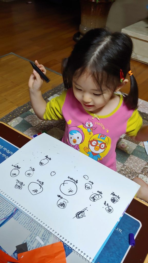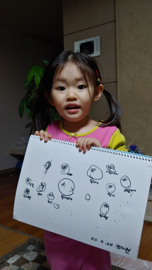 서현이가 가족을 그렸다. 할머니, 할아버지 부터 엄마 아빠 삼촌 동생 땅이 까지 온식구를 화폭에 담았다. 그림을 그리고 나서 누가 누구인지 말해준다. 처음에는 아무나 막 말하는 줄 알았다. 어떤 특징을 잡아서 그린게 아닌 손이 가는대로 그린듯하여 되는대로 말하는가보다 했는데 몇번을 다시 말해도 누가 누구인지 100퍼센트 일치했다. 위치를 외우는가 싶어서 폰 카메라로 찍어 확대해서 보여줘도 맞춘다. 심지어는 몇달이 지난 뒤에도 까먹지 않고 그대로 맞췄다. 아빠를 그린 모습을 보고 우리 딸 눈에 아빠가 저렇게 보이는건 아니겠지 살짝 걱정이 된다 ㅋㅋ