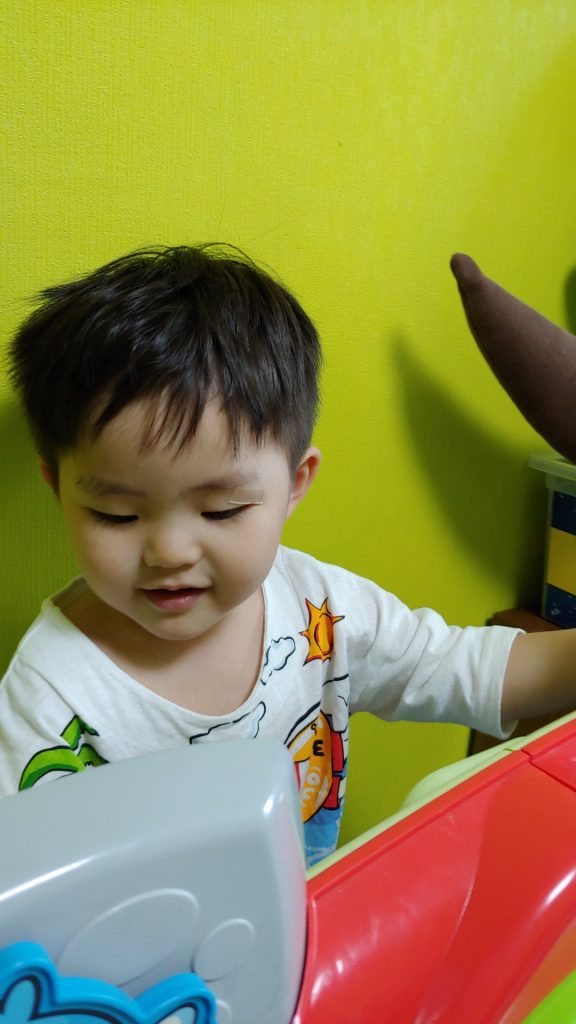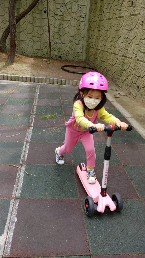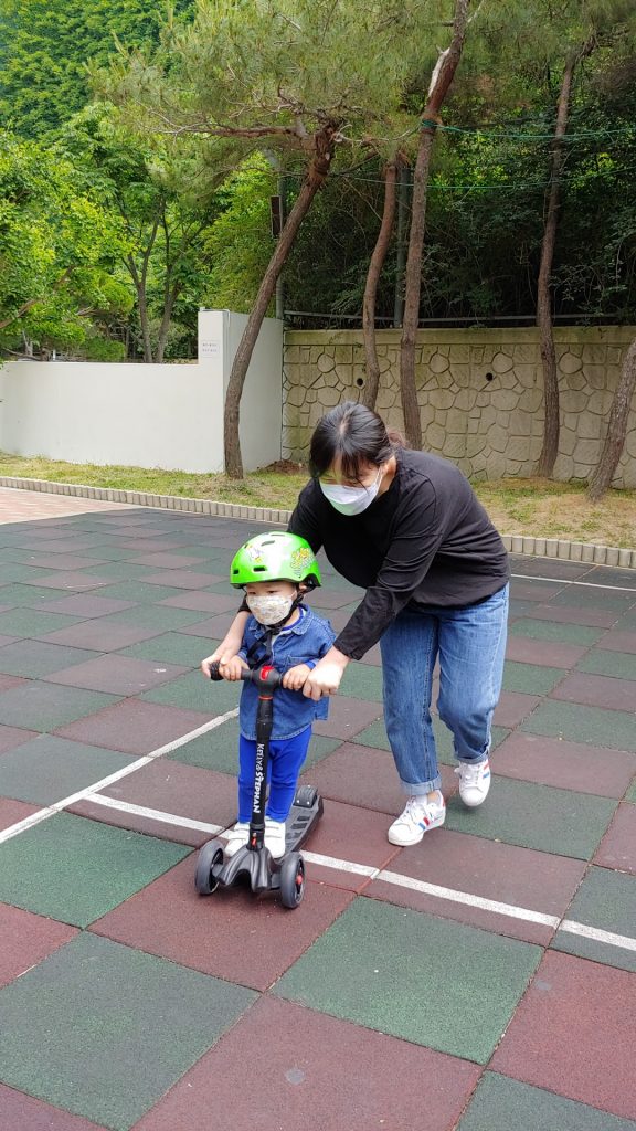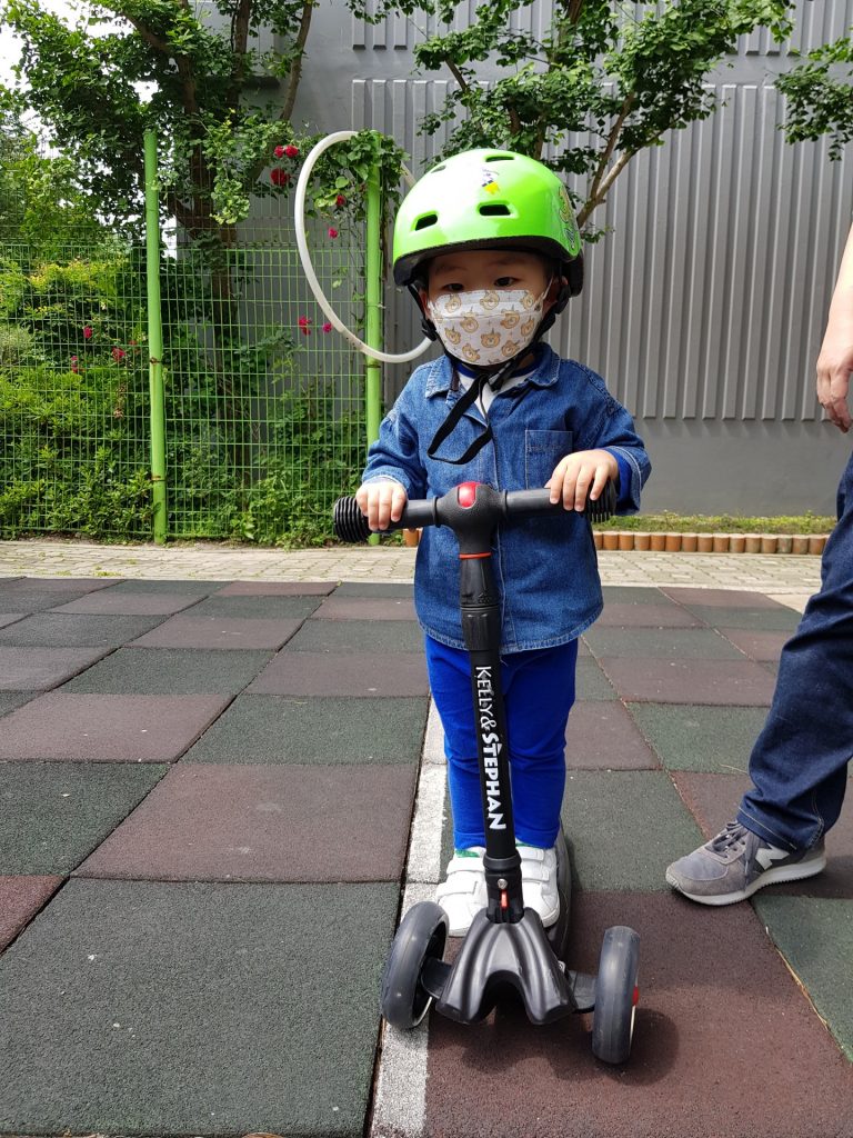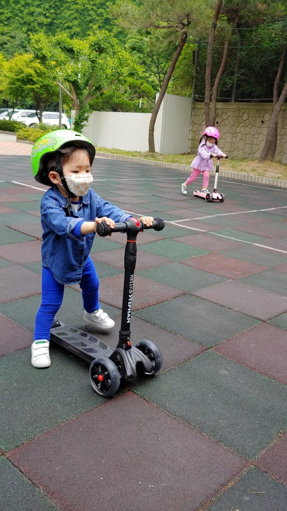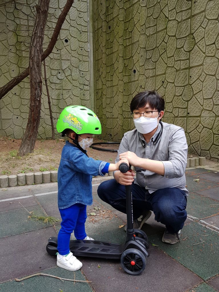 아빠는 내심 마루랑 같이 킥보드 타면서 배우길 바랐다. 하지만 모래놀이에 밀려서 아빠의 계획이 틀어지는 바람에 할머니집 놀이터에 킥보드 연습하러 갔다. 시현이는 발을 몇번 굴려보았지만 스스로 타고자하는 의지가 전혀 없는 관계로 엄마 아빠가 번갈아가며 밀어주었다. 엄마 아빠의 노동에 의해 앞으로 나가는 주제에 스피드 광ㅋㅋ 빨리 달리면 나오는 바퀴 불빛을 그렇게 또 보고 싶다고 노래부르는 아들 덕분에 엄마 아빠 운동 좀 했다😣