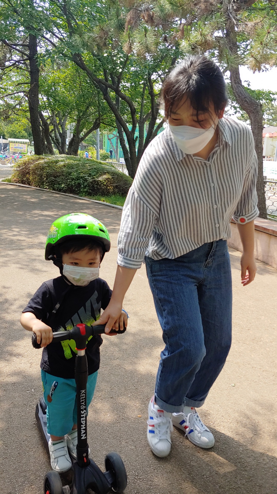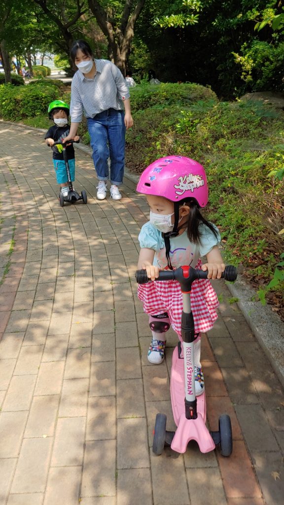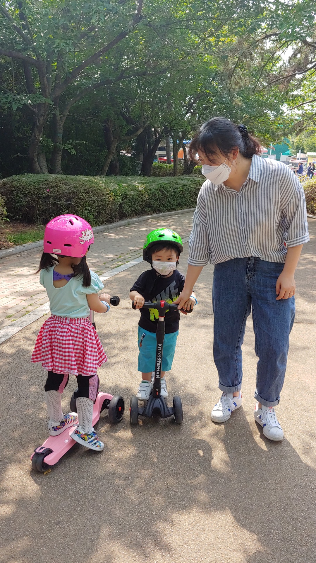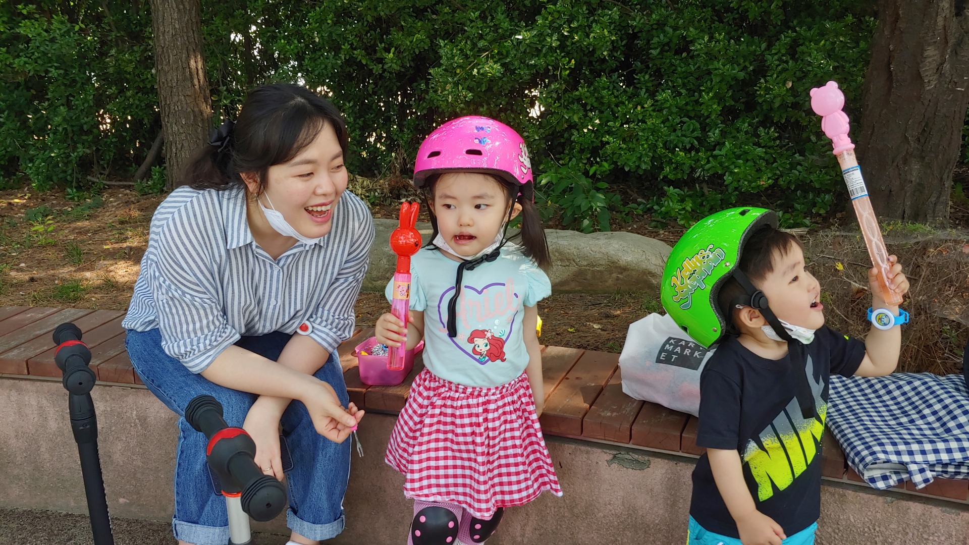 간식 부터 챙겨 먹고, 킥보드를 타기 시작하는 아이들. 서현이는 이제 혼자서도 곧잘 킥보드를 타지만, 시현이는 여전히 엄마가 밀어줘야 했다.