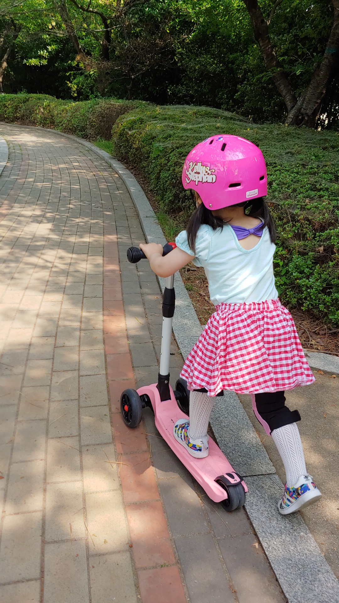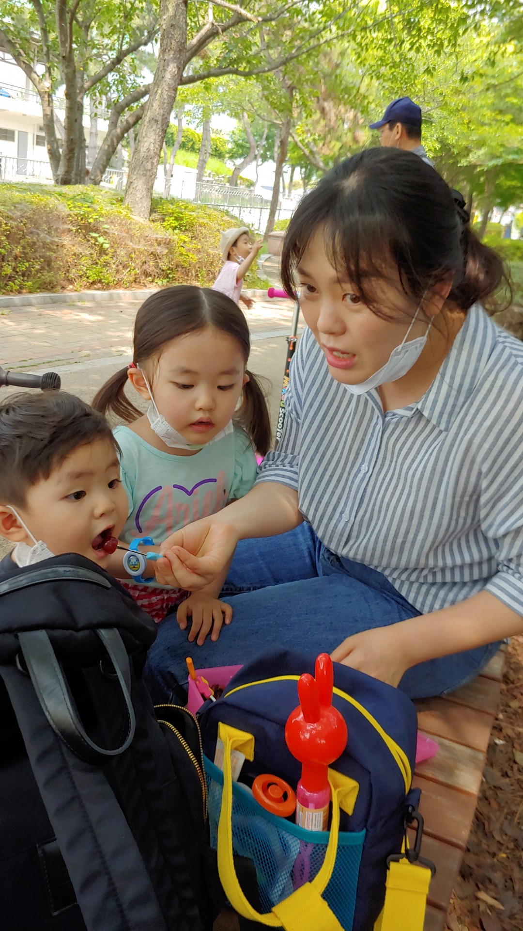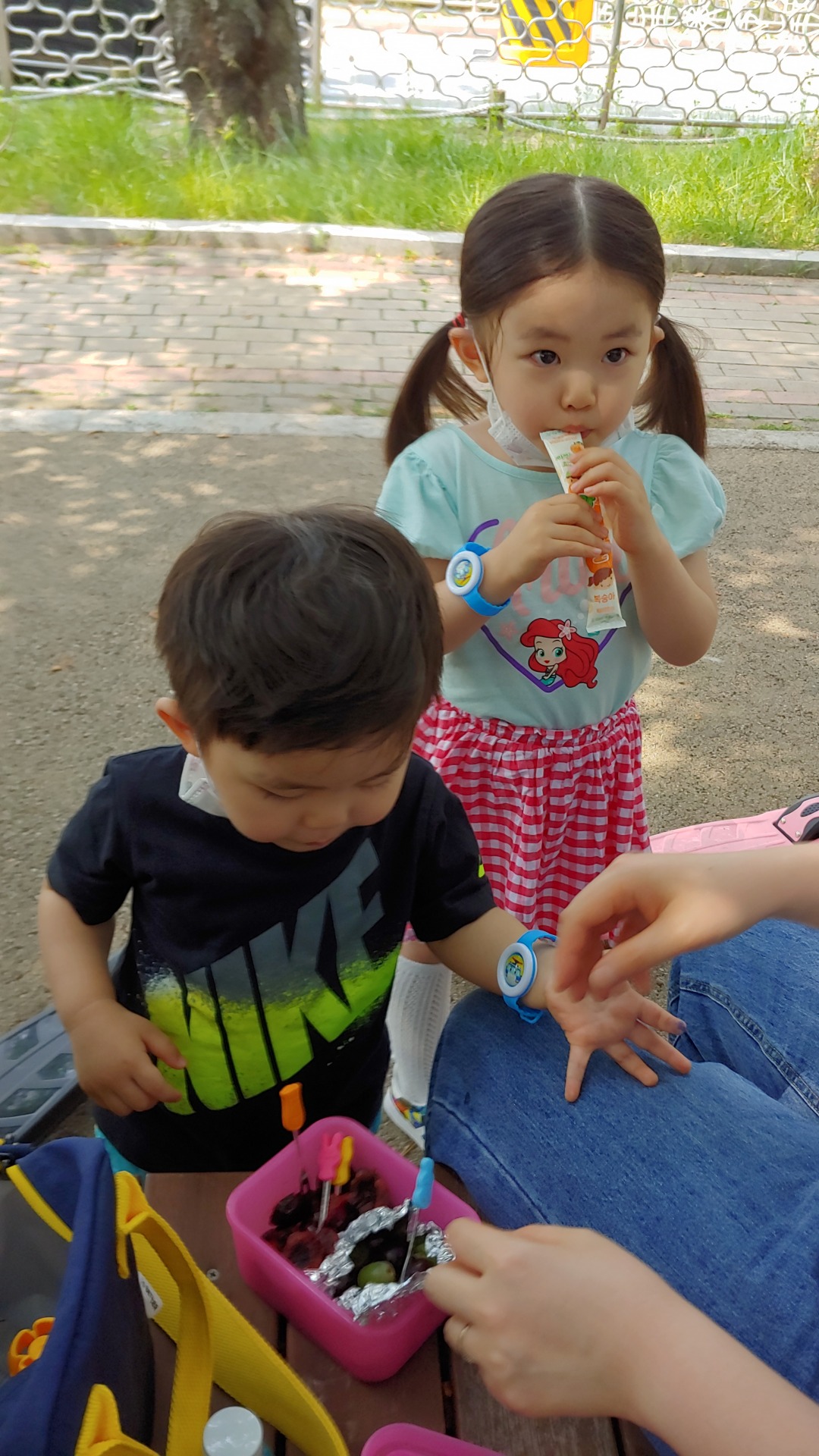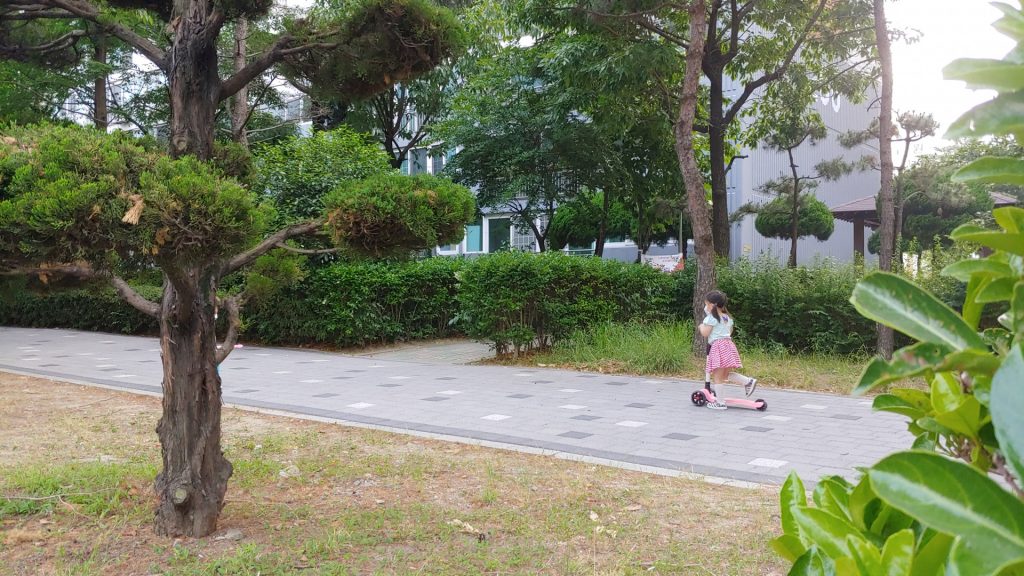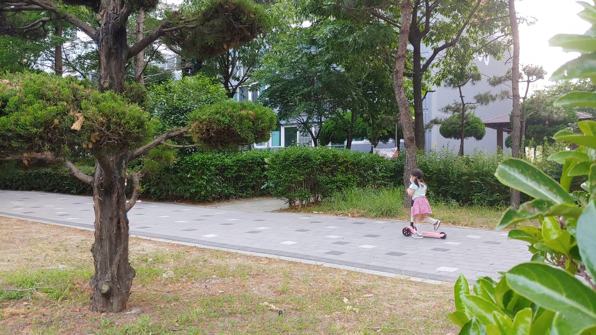 간식 부터 챙겨 먹고, 킥보드를 타기 시작하는 아이들. 서현이는 이제 혼자서도 곧잘 킥보드를 타지만, 시현이는 여전히 엄마가 밀어줘야 했다.