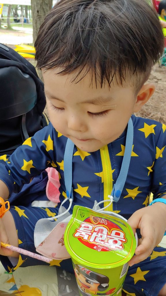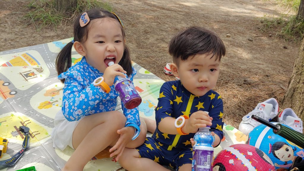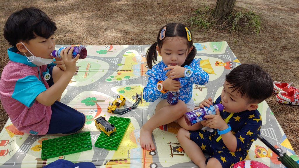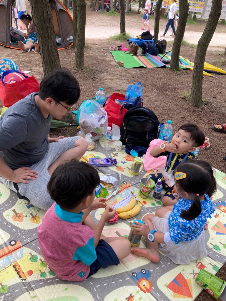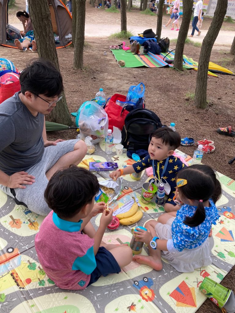 모래 놀이 중 시현이 눈에 모래가 들어가서 일단 중지. 자리로 돌아와서 인공 눈물로 씻어줬다. 이때 이후로 눈이 조금만 불편하면 인공 눈물부터 찾는 아이들 🤣 어쨌든 놀이 중단된 김에 점심 식사를 하고 놀기로 했다. 점심 메뉴는 한국인이 사랑하는 취킨~🍗