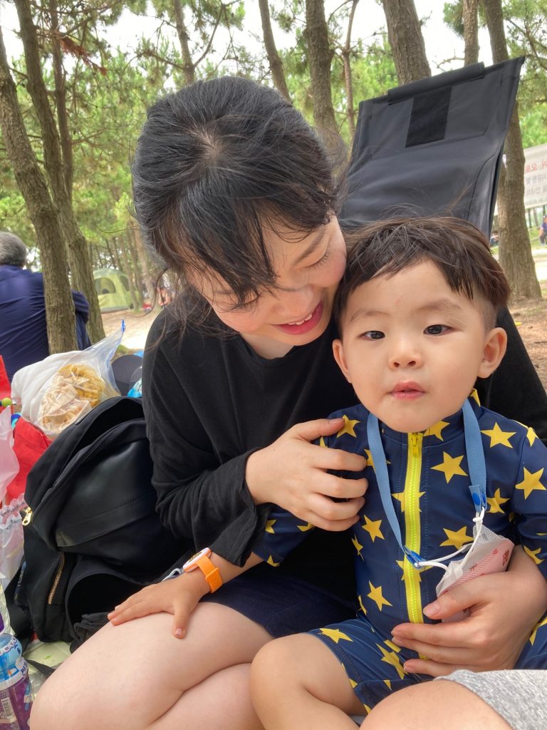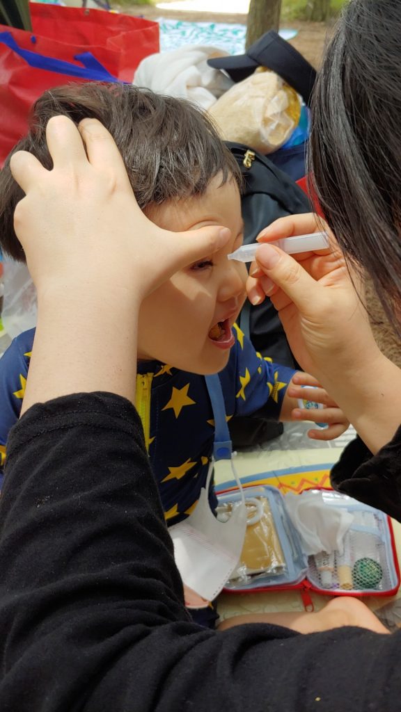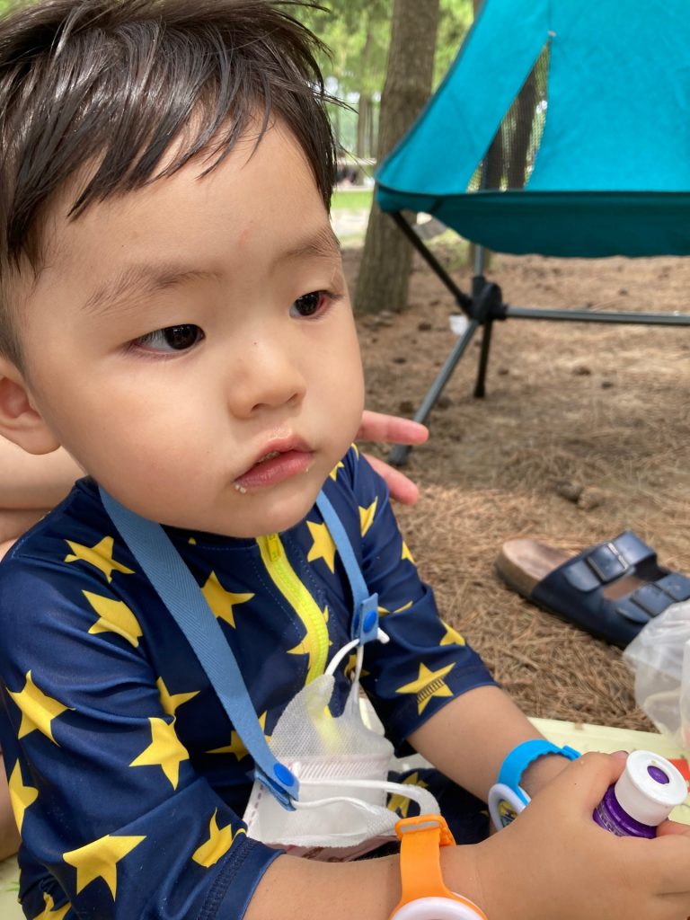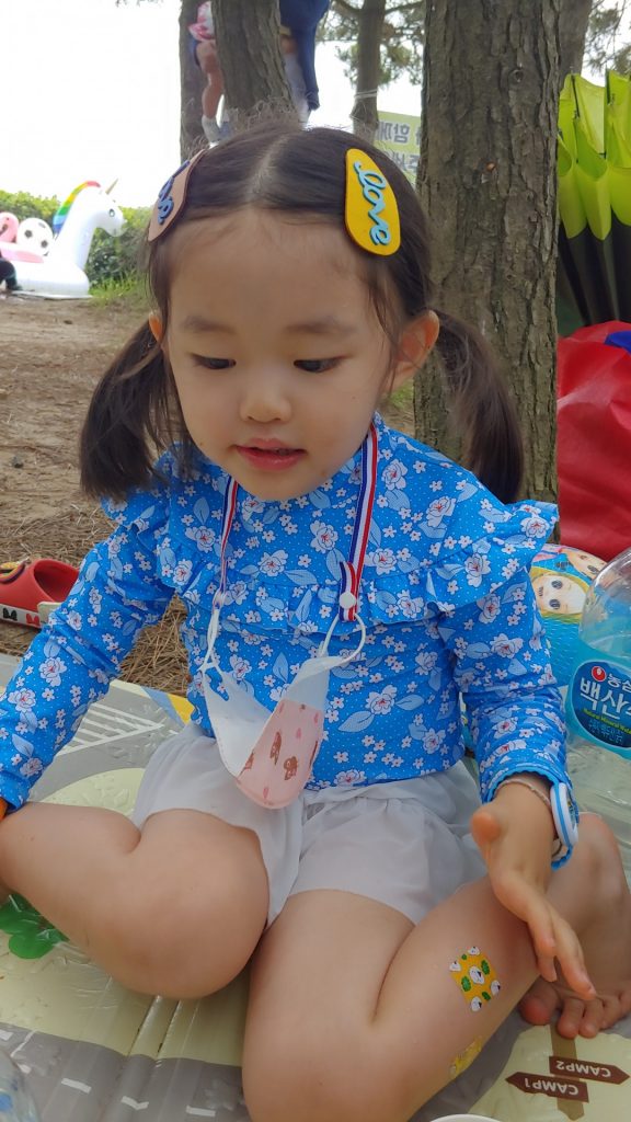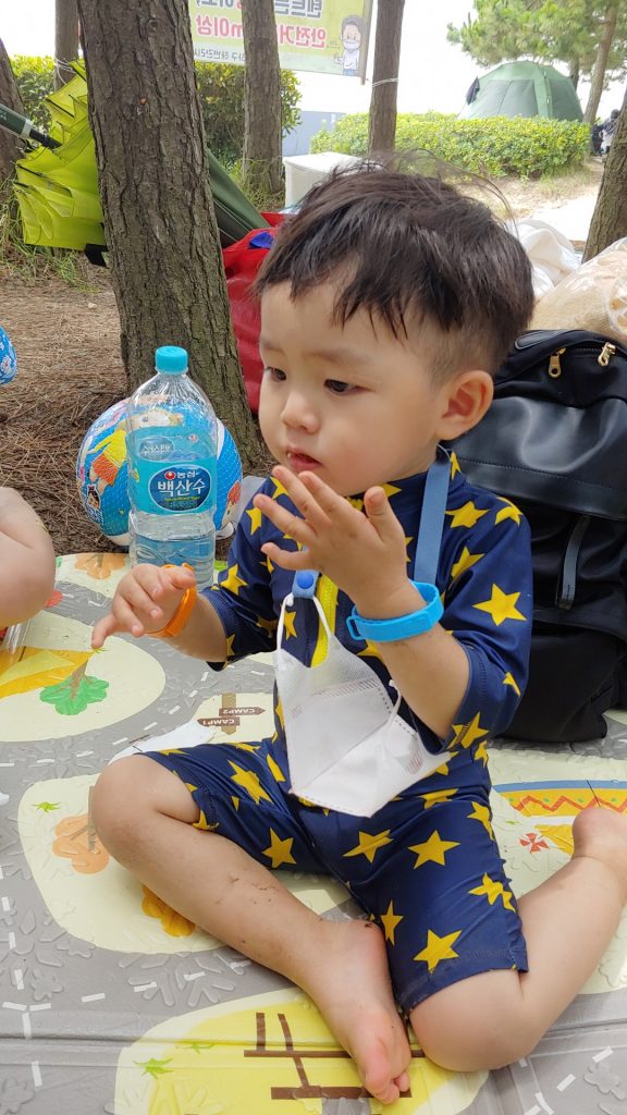 모래 놀이 중 시현이 눈에 모래가 들어가서 일단 중지. 자리로 돌아와서 인공 눈물로 씻어줬다. 이때 이후로 눈이 조금만 불편하면 인공 눈물부터 찾는 아이들 🤣 어쨌든 놀이 중단된 김에 점심 식사를 하고 놀기로 했다. 점심 메뉴는 한국인이 사랑하는 취킨~🍗