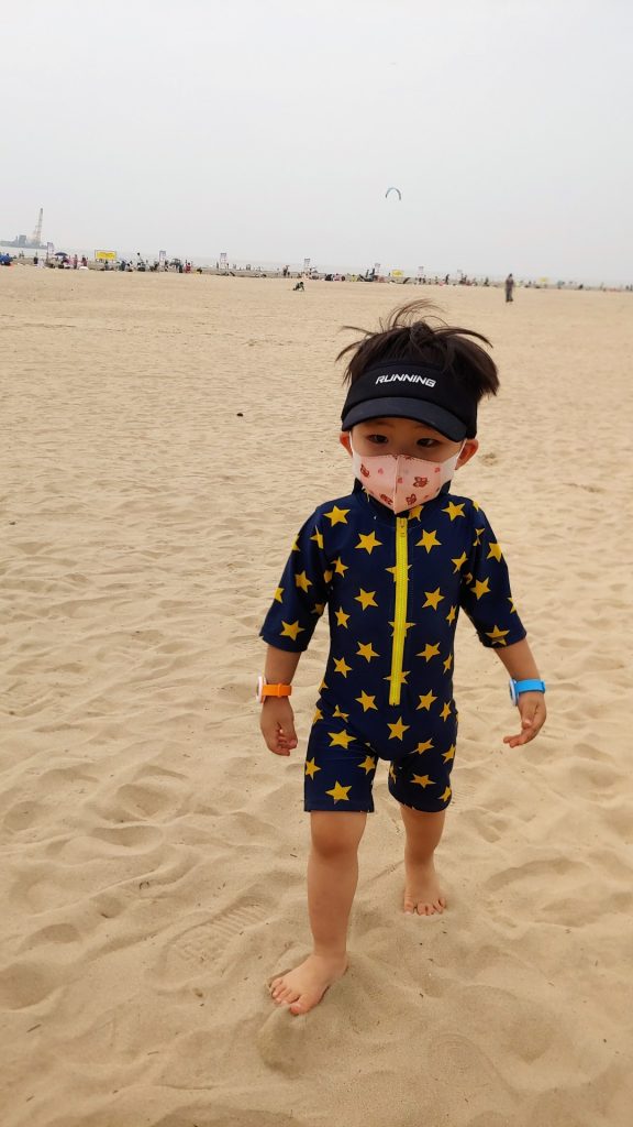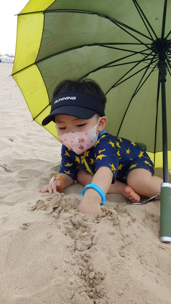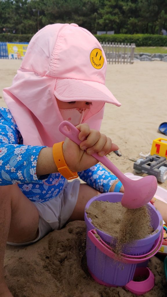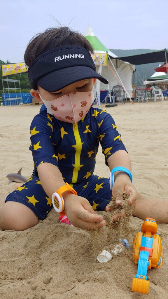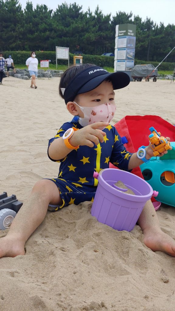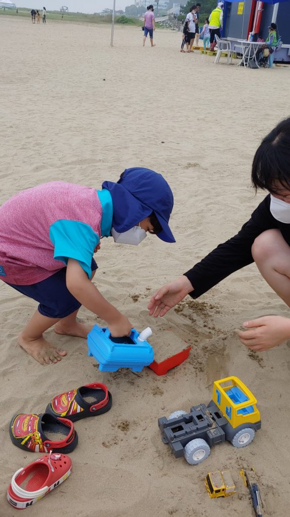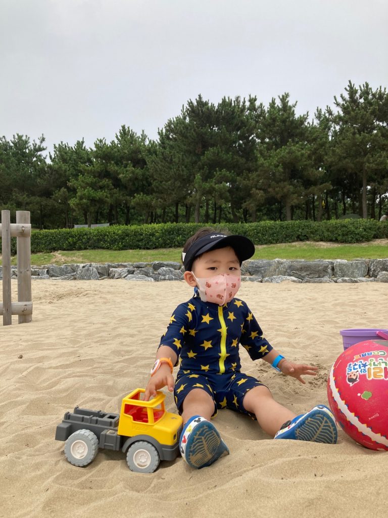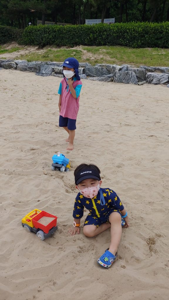 다대포에 가는 주된 목적인 모래놀이. 키즈카페랑 집에서 가짜모래 조금으로 깔짝 깔짝하다가 넓은 모래사장에 풀어 놓으니 애들이 아주 푹 빠졌다. 모래놀이 전용 장난감도 좀 사고,