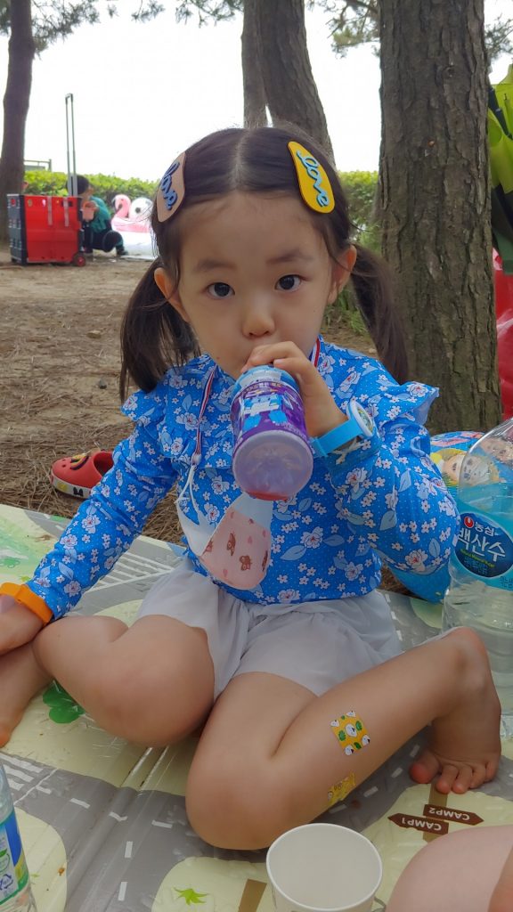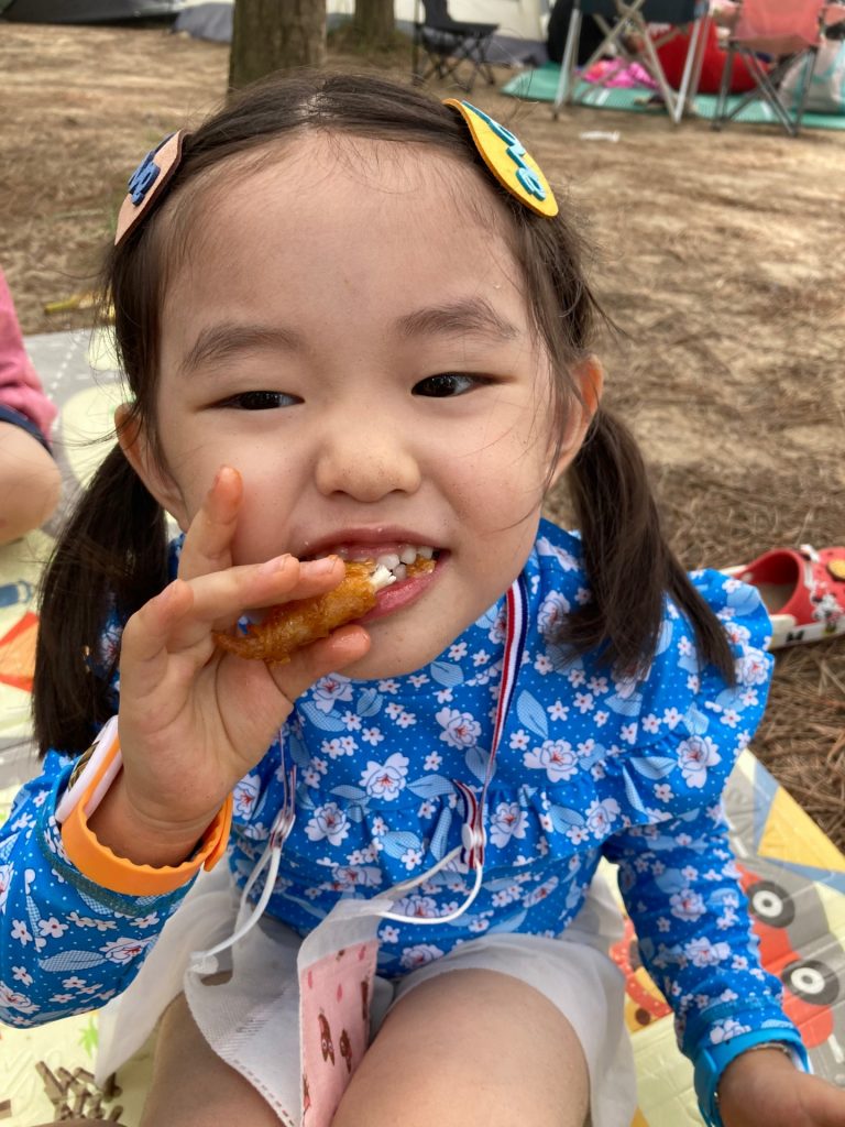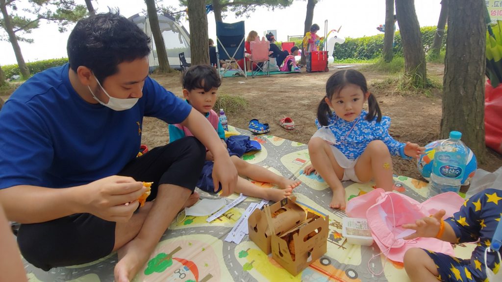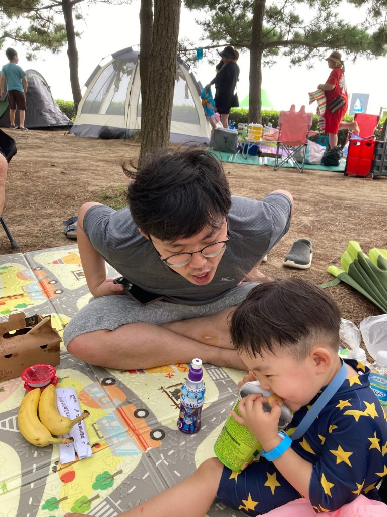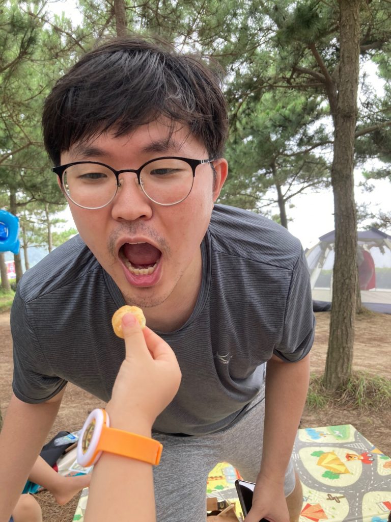 신나게 놀다 보니 점심으로 먹은 치킨은 이미 소화된 아이들. 맛있게 간식을 먹고 있는 아이들과 코흘리개들 간식을 빼먹고 싶은 아빠. 한입만~