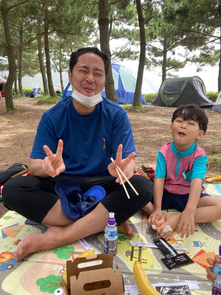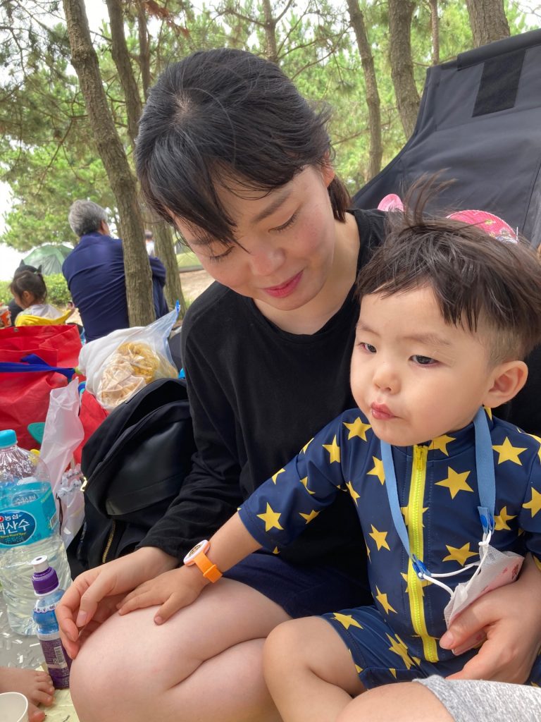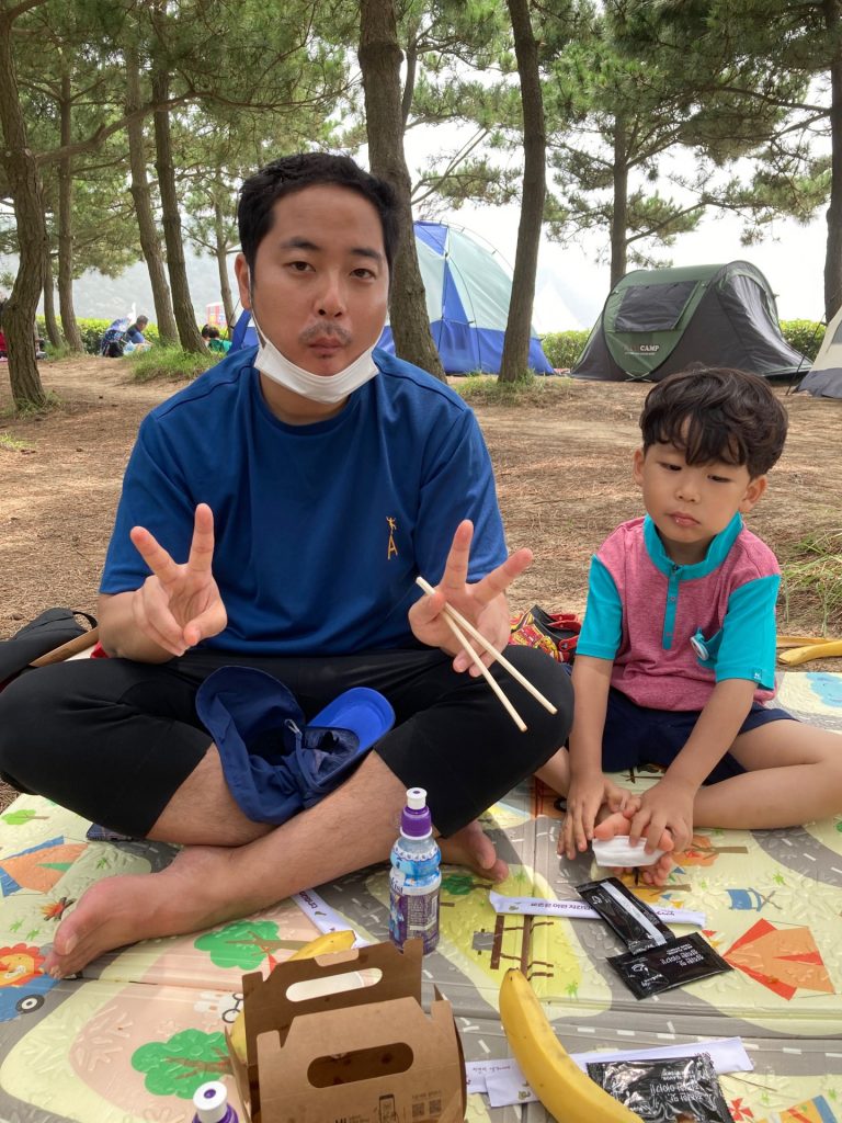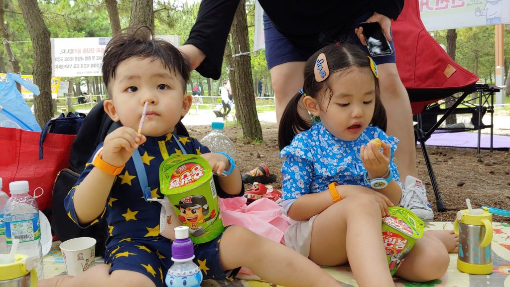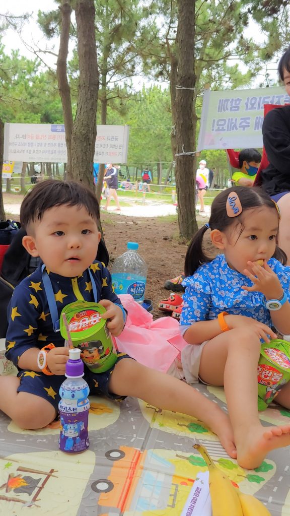 신나게 놀다 보니 점심으로 먹은 치킨은 이미 소화된 아이들. 맛있게 간식을 먹고 있는 아이들과 코흘리개들 간식을 빼먹고 싶은 아빠. 한입만~