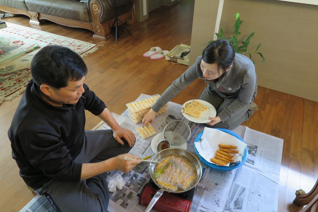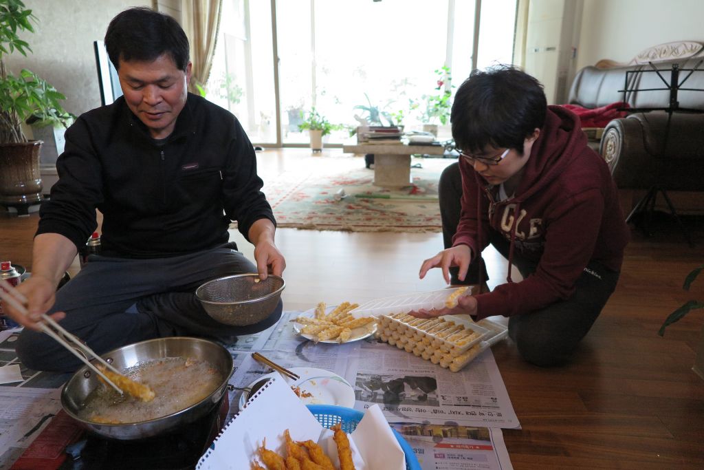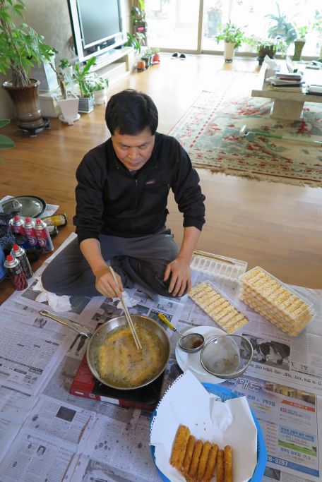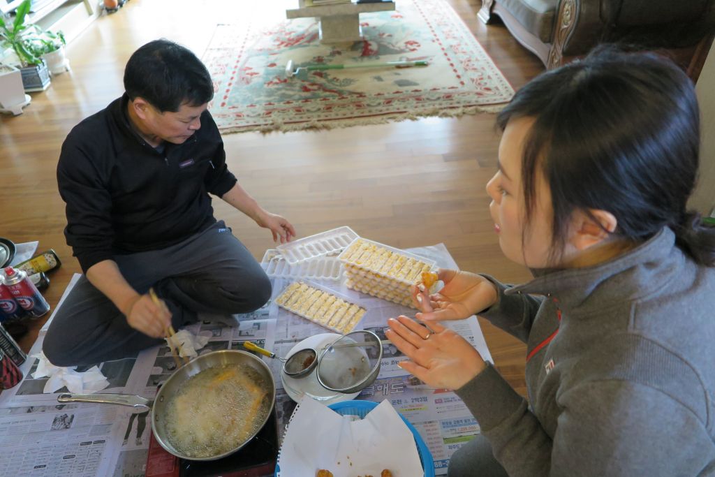 튀김 장인인 아버님께서 새우튀김을 튀기셨어요. 명절요리의 꽃인 만들고 있을 때 시식하기를 하고있네요 ㅎㅎ